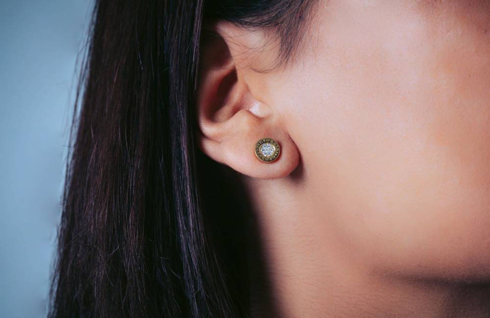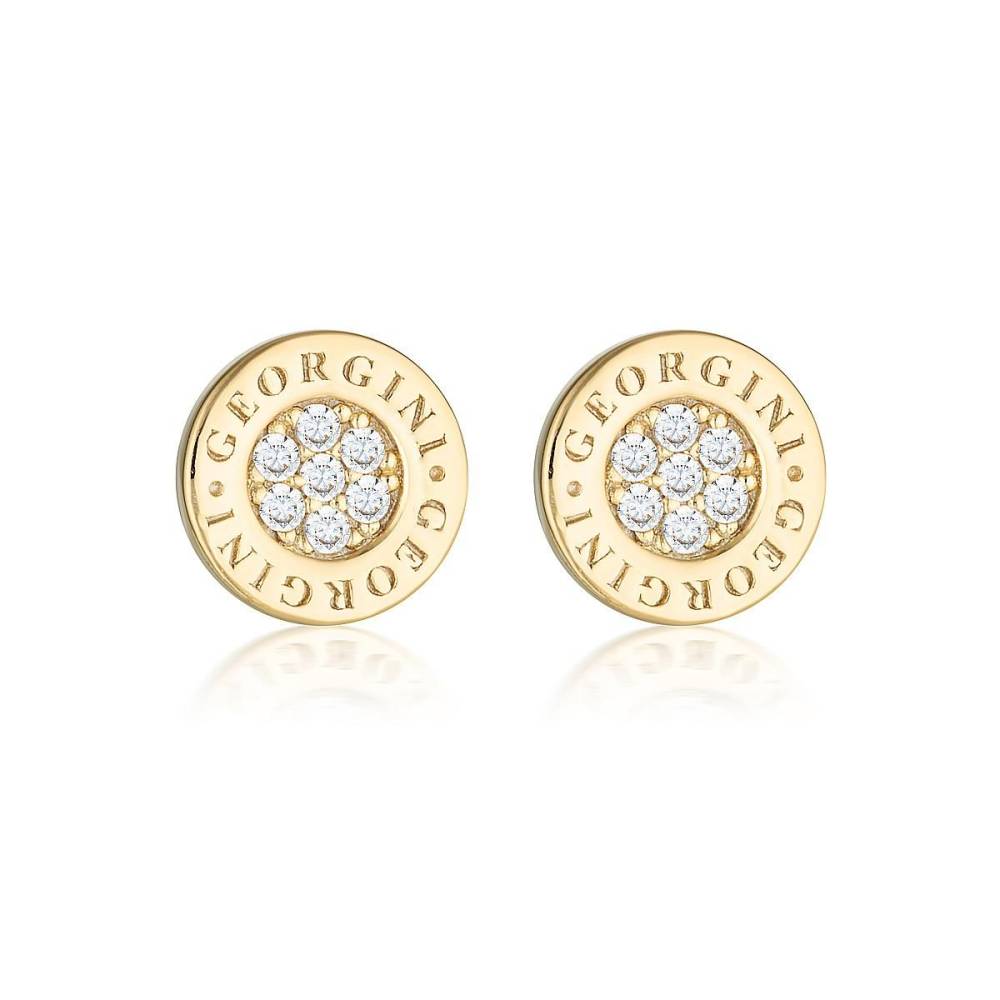 Georgini gold plated round stud earrings with cubic zirconia pave set in the centre surrounded by the Georgini logo.