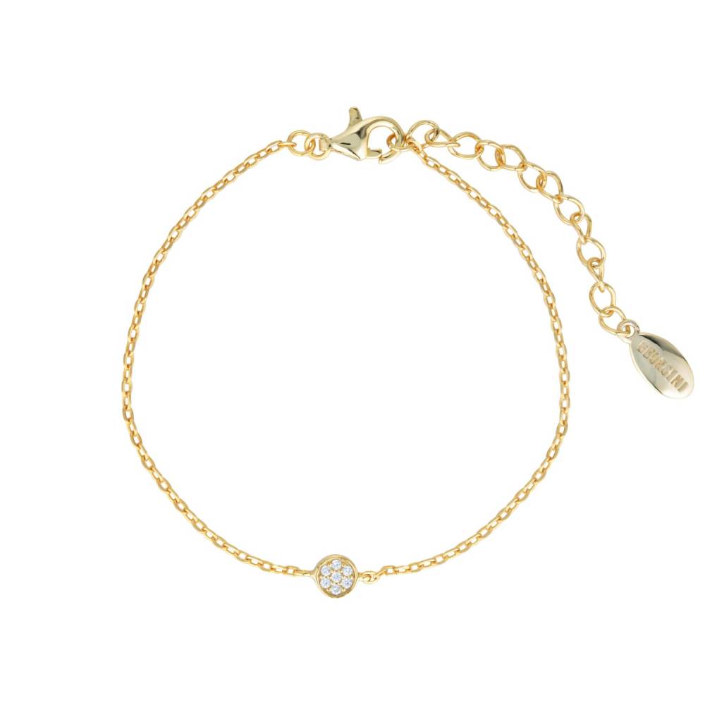 Georgini gold plated chain bracelet with a central round disc pave set with sparkling cubic zirconia. This bracelet is 18ct gold plated on sterling silver.