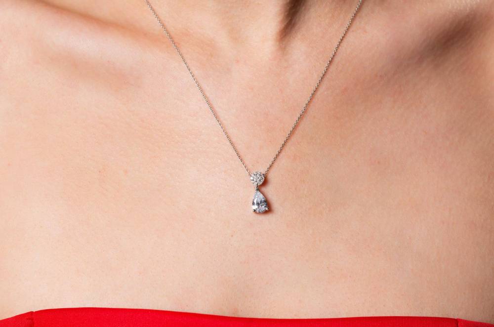 Georgini sterling silver pendant with a round cluster of cubic zirconia and a pear shaped cubic zirconia drop. Chain length 41-46cm.
