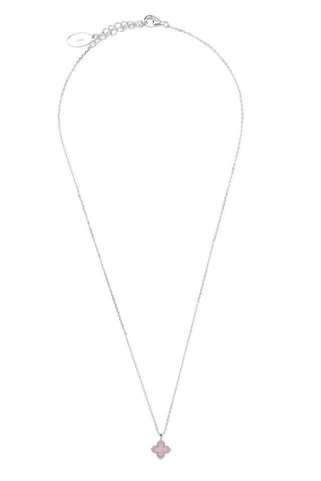 This exquisite piece showcases an iridescent mother-of-pearl pointed four-leaf clover, beautifully adorned with shimmering stone set edging on both sides. Crafted from Rhodium Plated 925 sterling silver, this double-sided pendant gracefully hangs from a 45cm chain featuring a sliding ball adjuster for a customised fit.