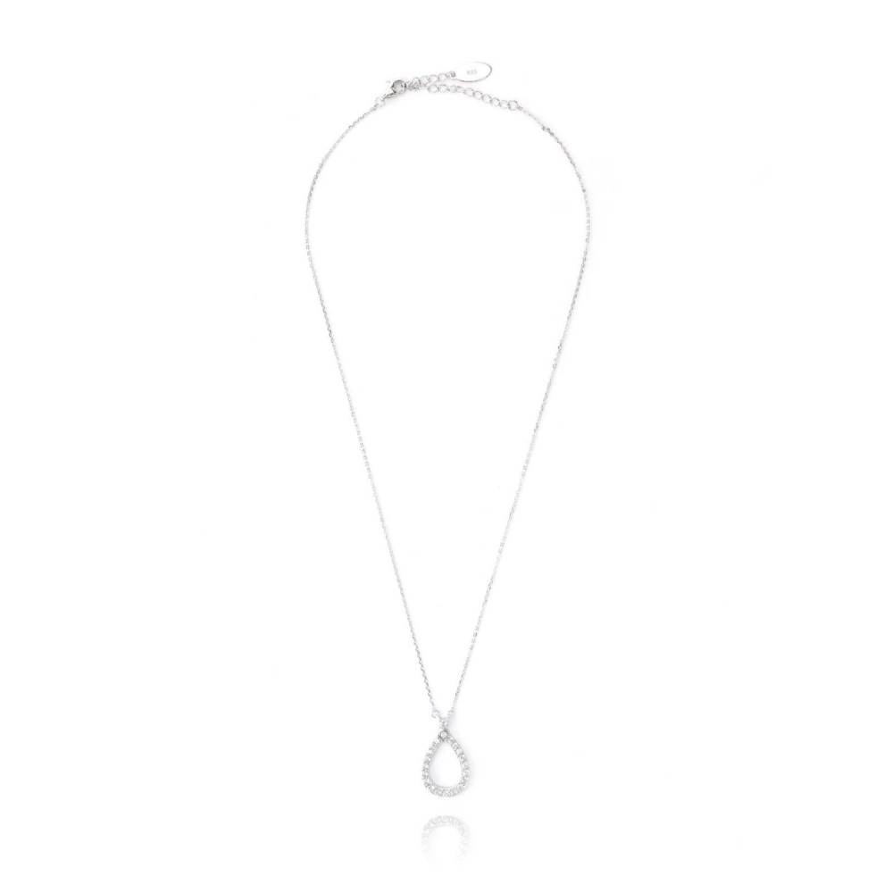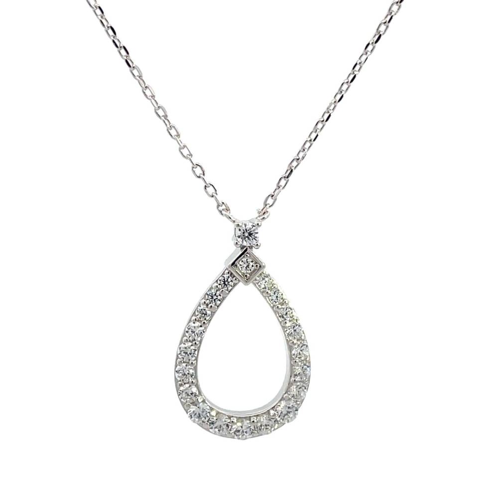 Georgini sterling silver open teardrop shaped pendant necklace set with sparkling cubic zirconia. This pendant is rhodium plated which prevents the silver tarnishing over time. Pendant size 14mm x 23mm. Length 41-46cm.