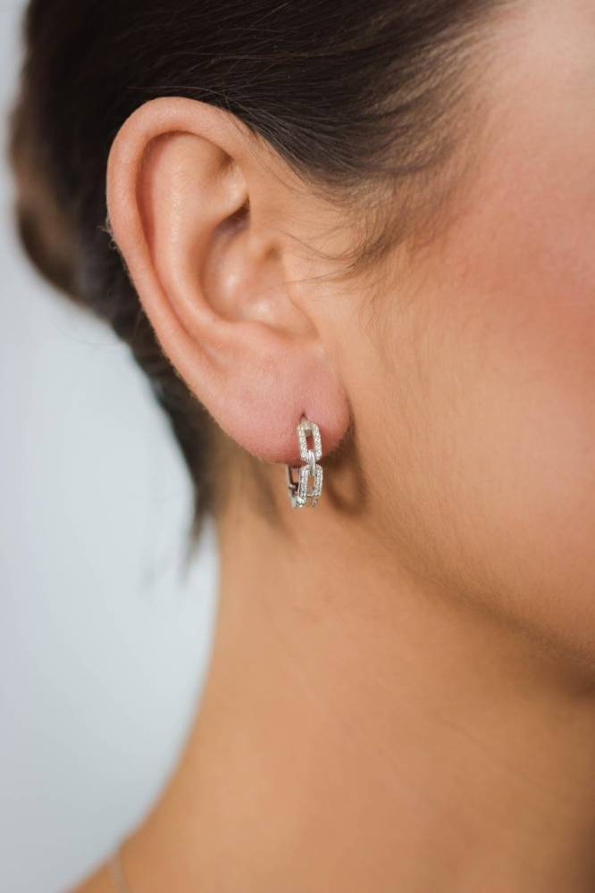 Georgini link hinged hoop earrings set with sparkling cubic zirconia. These earrings are crafted in rhodium plated sterling silver to help prevent tarnishing. Size 17mm.