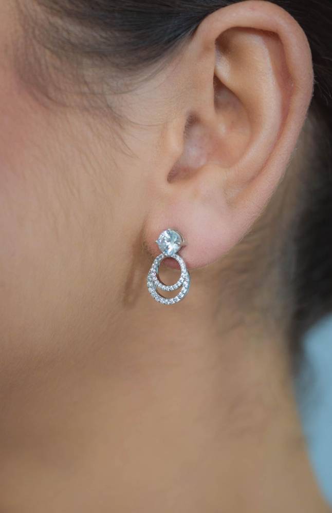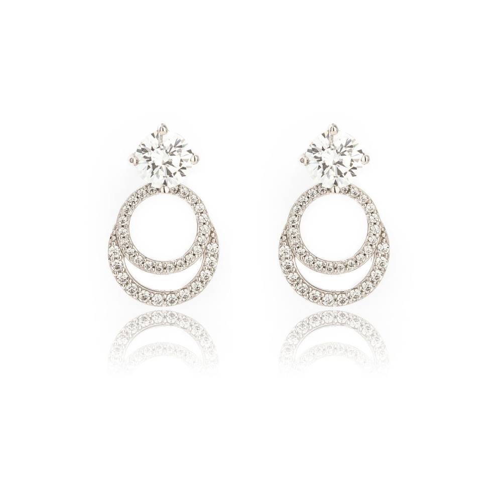 Georgini sterling silver cubic zirconia earrings. A single cubic zirconia sits at the top of two open pave set cubic zirconia circles. 10mm x 17mm. Rhodium plated sterling silver helps prevent tarnishing