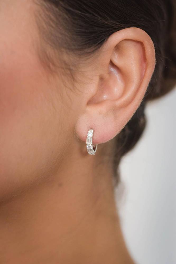 Georgini sterling silver mixed round and baguette cut cubic zirconia small hoop earrings. Diameter approximately 15.16mm.