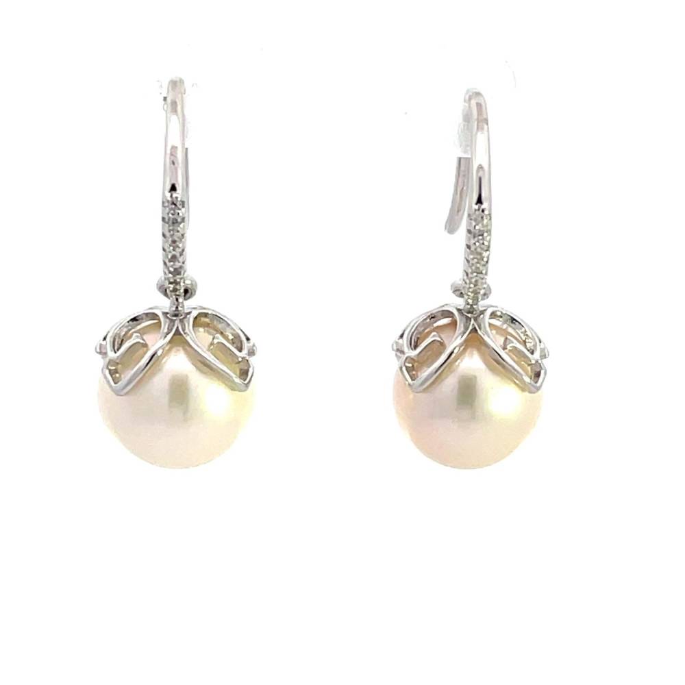 Sterling silver freshwater pearl hook earrings set with sparkling cubic zirconia. The hook style fitting makes them super easy to wear. 9mm freshwater pearl.