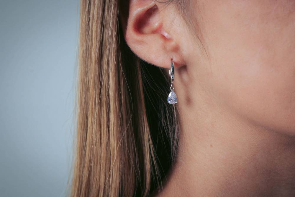Georgini sterling silver hoop earrings with a drop pear shaped cubic zirconia.