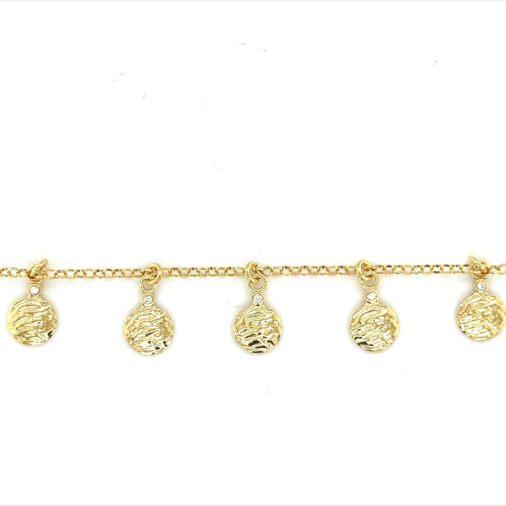 Gold plated on silver bracelet with five hammered finish disc drops each set with a cubic zirconia. This bracelet has a matching necklace.