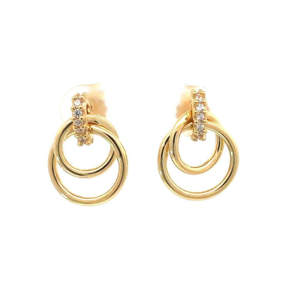 Gold plated on sterling silver double interlocking open circle stud earrings set with cubic zirconia.