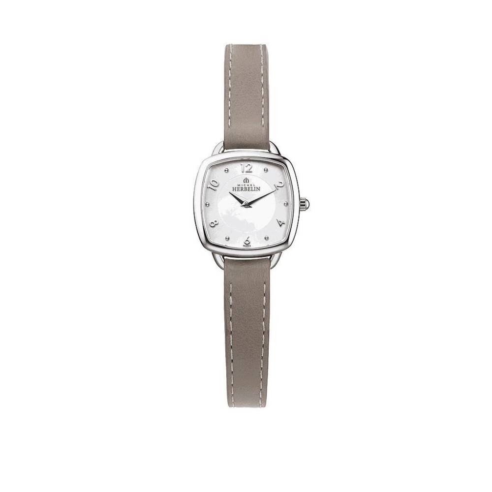 Herbelin ladies stainless steel watch featuring a cushion shaped part mother of pearl dial on a beige stitched leather strap. Curved lines and a touch of modernity to this urbanite and classic collection.