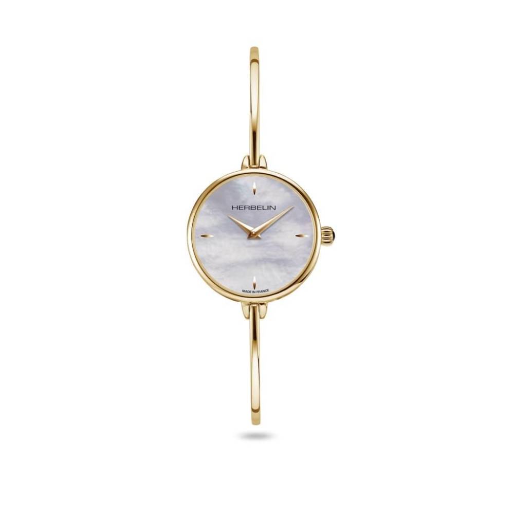 With its round shape, Fil concentrates on the essentials with only four indexes. Herblein Fil gold PVD watch with a feature round mother of pearl simple dial on a very slim gold plated bangle. This watch is more like a piece of jewellery than a watch. Case 26mm. Powered by a Swiss quartz movement with a sapphire crystal glass.