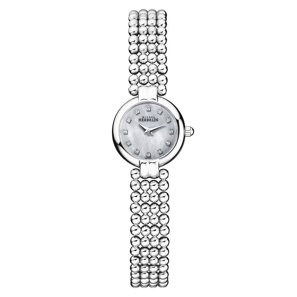 Ladies stainless steel Herbelin watch, from the Perles collection in the mini size this watch has a round mother of pearl stone set dial and is on a beautiful ball linked flat bracelet. Case approx 21mm. Swiss quartz movement.