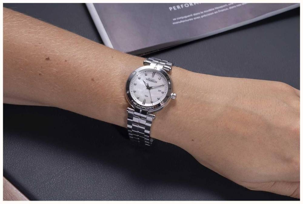 Herbelin ladies Newport watch in stainless steel with a feminine mother of pearl diamond dot dial and a date window at 3o’clock. This watch has a brushed and polished stainless steel bracelet. 100m water resistant, this Herbelin watch has a Swiss movement and scratch resistant sapphire crystal glass.