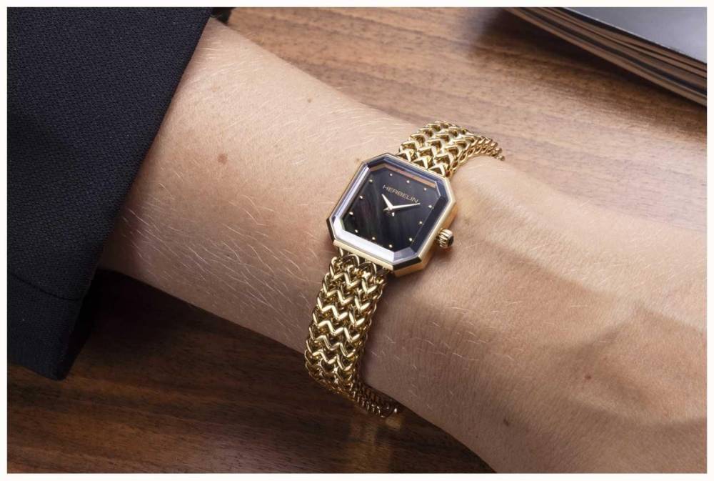 This Herbelin watch has a beautiful octogon shaped case with a black mother of pearl dial and is on a mesh woven link gold PVD bracelet. Case 22.2mm. This Octogone watch has been made in France using a Swiss movement and it has a scratch resistant sapphire crystal glass. 50m water resistant.