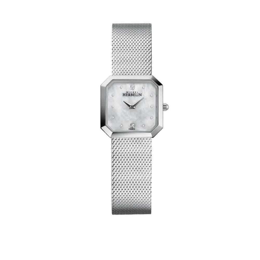 Herbelin ladies stainless steel Octogone watch with an octogone mother of pearl stone set dial on a flat milanese bracelet. Swiss quartz movement. 24.5mm case.