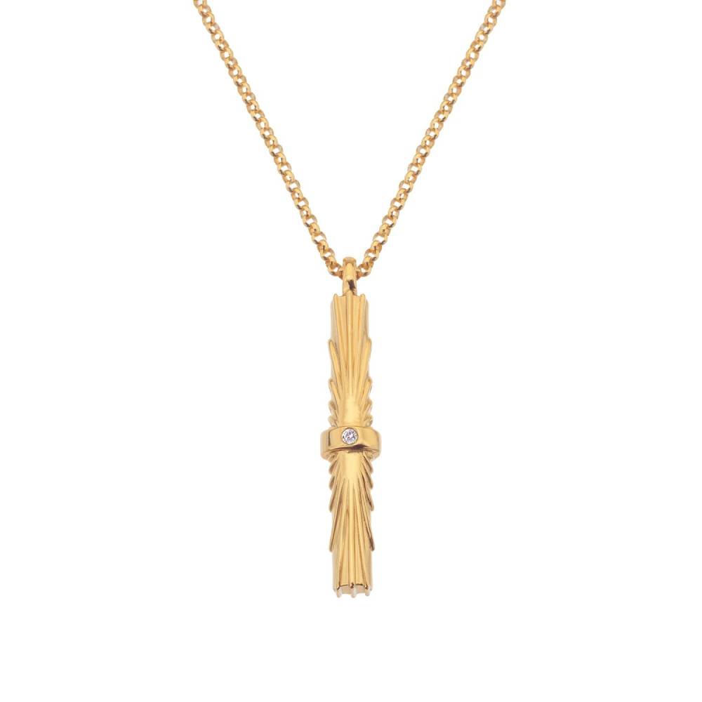 The ‘Hope’ collection is about positivity – harder lines and angles and a sunburst theme to emulate hope and optimism. This pendant is crafted from 925 sterling silver, plated with 18ct gold and hand-set with a real diamond. It’s confident, fresh and stunning – love it! Jac x The pendant measures 5mm x 28mm. 45-50cm chain.