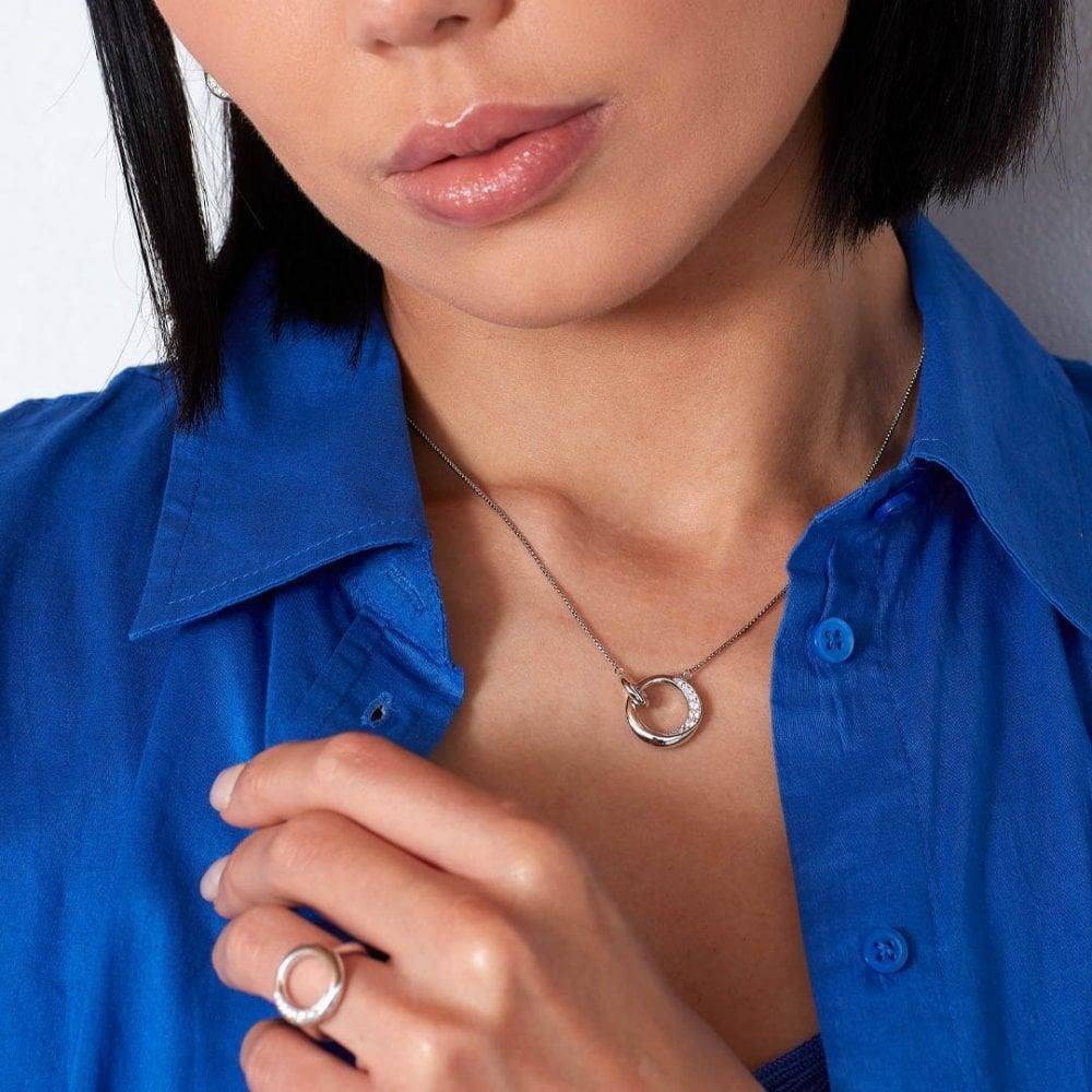 Bevel Cirque 18-inch necklet is a delight to wear, with a smaller circle interlinked with a larger circle beautifully set in sparkling pavé cubic zirconia. And, for added versatility, the larger Cirque link can be worn either with the pavé cubic zirconia showing or reversed to wear as silver.