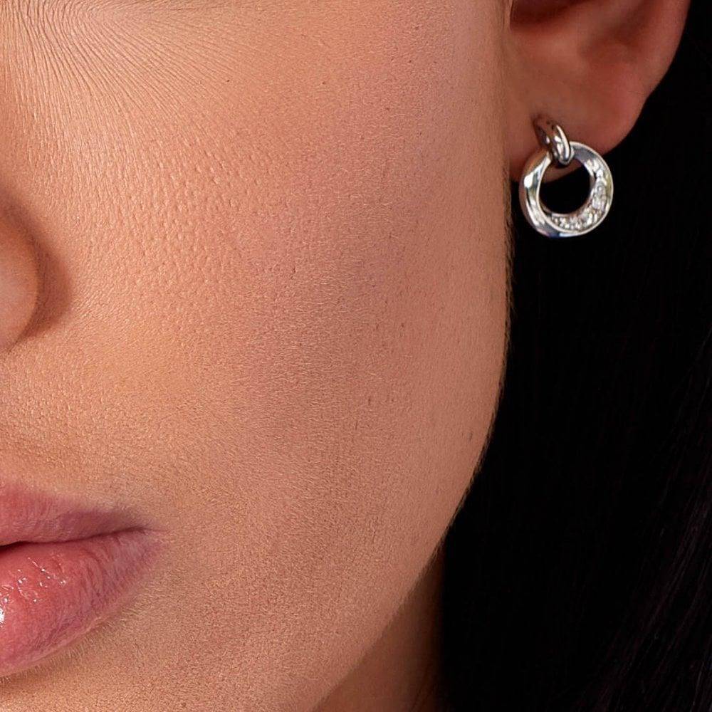 These gorgeous Bevel Cirque Pavé stud drop earrings certainly add a touch of sparkle when the occasion arises. Designed in highly polished, rhodium-plated sterling silver with a flip-and-turn link, you can alternate which side to show to suit your mood—either in their simple yet elegant silver splendour or the glamorous pavé set curves.