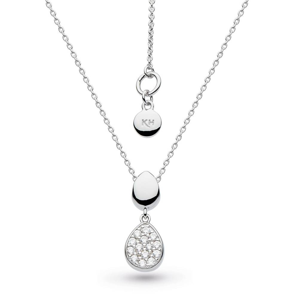 Kit Heath sterling silver double pebble drop pendant pave set with glistening cubic zirconia. 18″ sterling silver chain.