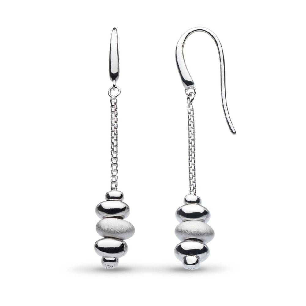 Kit Heath sterling silver coast tumble drop earrings with a pile of pebbles at the bottom in a mixture of satin and polished finishes.