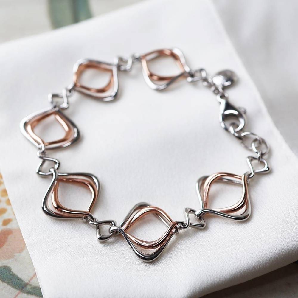 This three dimensional sterling silver bracelet is created from two layers of sterling silver with rhodium plating and 18ct rose gold plate weaving together, inspired by themes of entwining and interlocking in eternal harmony. Bracelet length 7.5″. Height 4mm. Depth 19mm.