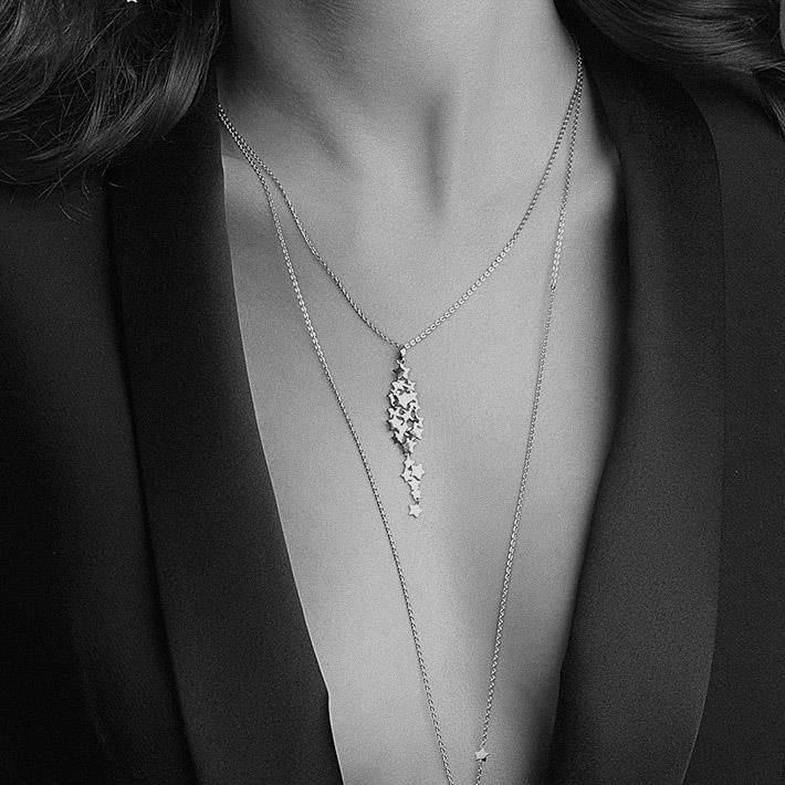 Kit Heath sterling silver stargazer galazy necklace, inspired by the night sky a beautiful cluster of stars. Sterling silver 18″ chain. Pendant length 5.7cm