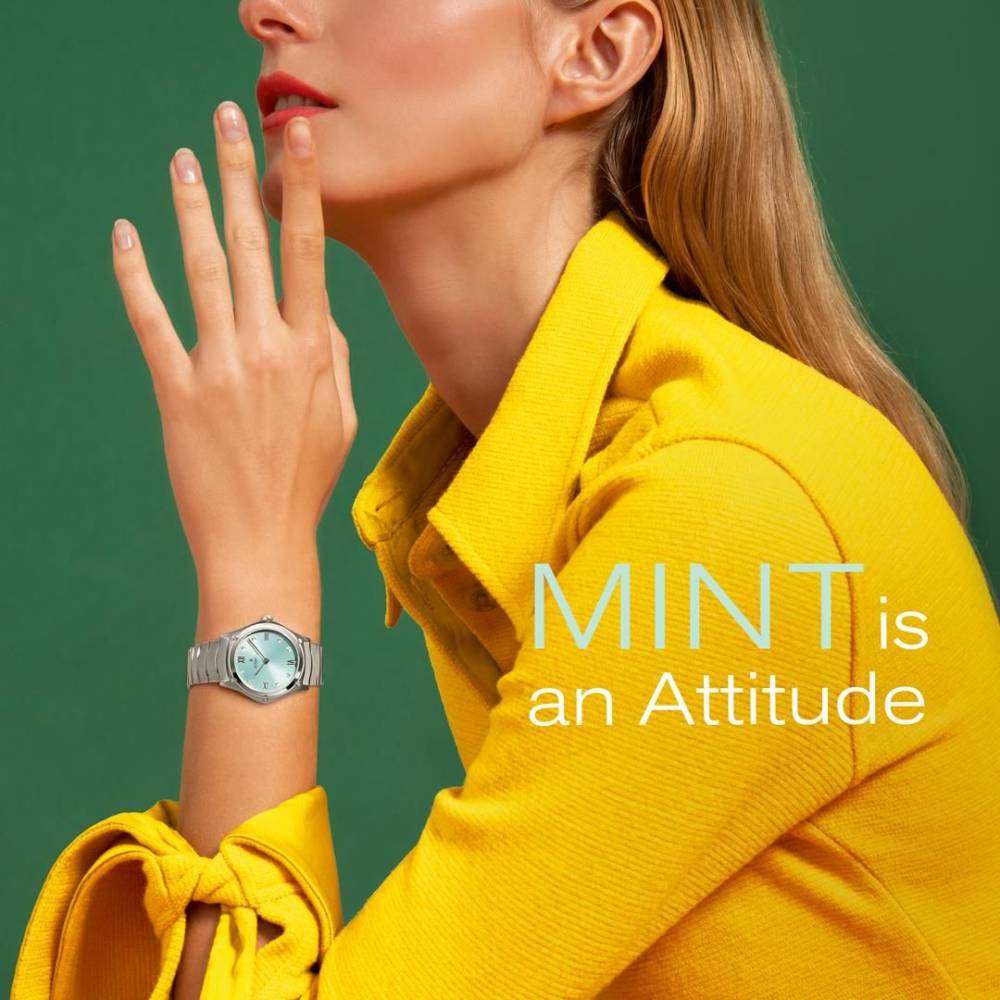 Ladies Sport Classic Grande stainless steel 33mm case. Mint blue galvanic dial with applied Roman numerals and 8 diamonds (0.052ct). Stainless steel wave link bracelet with a folding clasp, Swiss quartz movement, water-resistant up to 5 bar