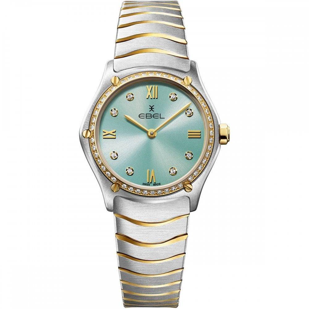 Stainless steel and 18ct yellow gold 29mm case with 47 diamonds (0.3055ct) Mint blue galvanic dial with 3N yellow gold-plated Roman numerals and 8 diamonds (0.0512 ct), brushed and polished finishing, two-tone stainless steel wave link bracelet with a folding clasp, Swiss quartz movement, water-resistant up to 50 meters