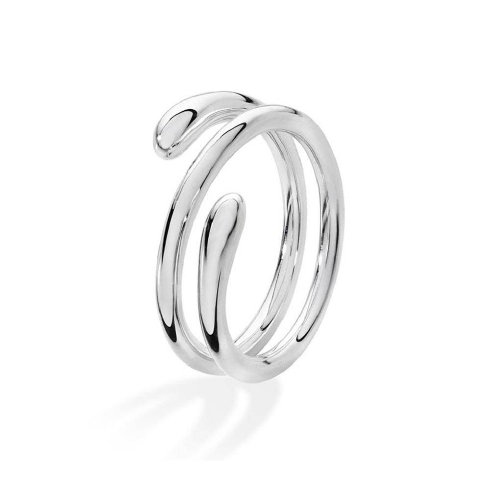 Sterling silver ring which coils and wraps around your finger to create a beautiful design. This ring is easily squeezed down or stretched up. It is perfect for anyone who likes to swap their ring onto different fingers or often get swollen fingers at different times of the day. Rhodium Overlay to help prevent tarnishing and to increase shine, lustre, and durability. Size N.