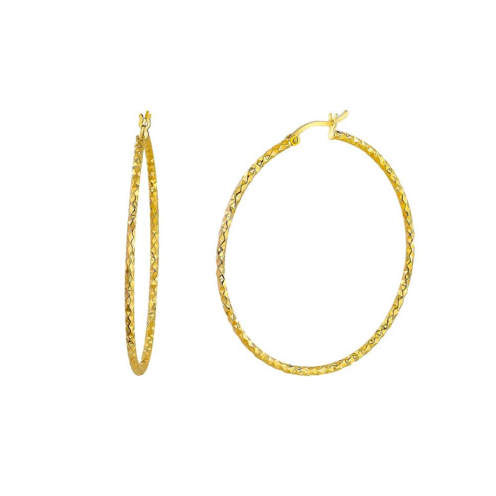 Made from sterling silver with a 9ct gold plating these 45mm hoop earrings have a lovely diamond cut pattern which sparkles in the light.