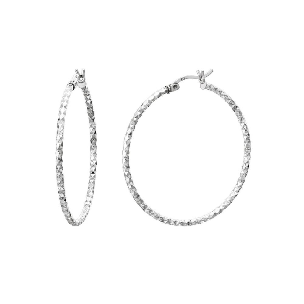 Sterling silver 35mm hoop earrings with a diamond cut design that sparkles in the light.