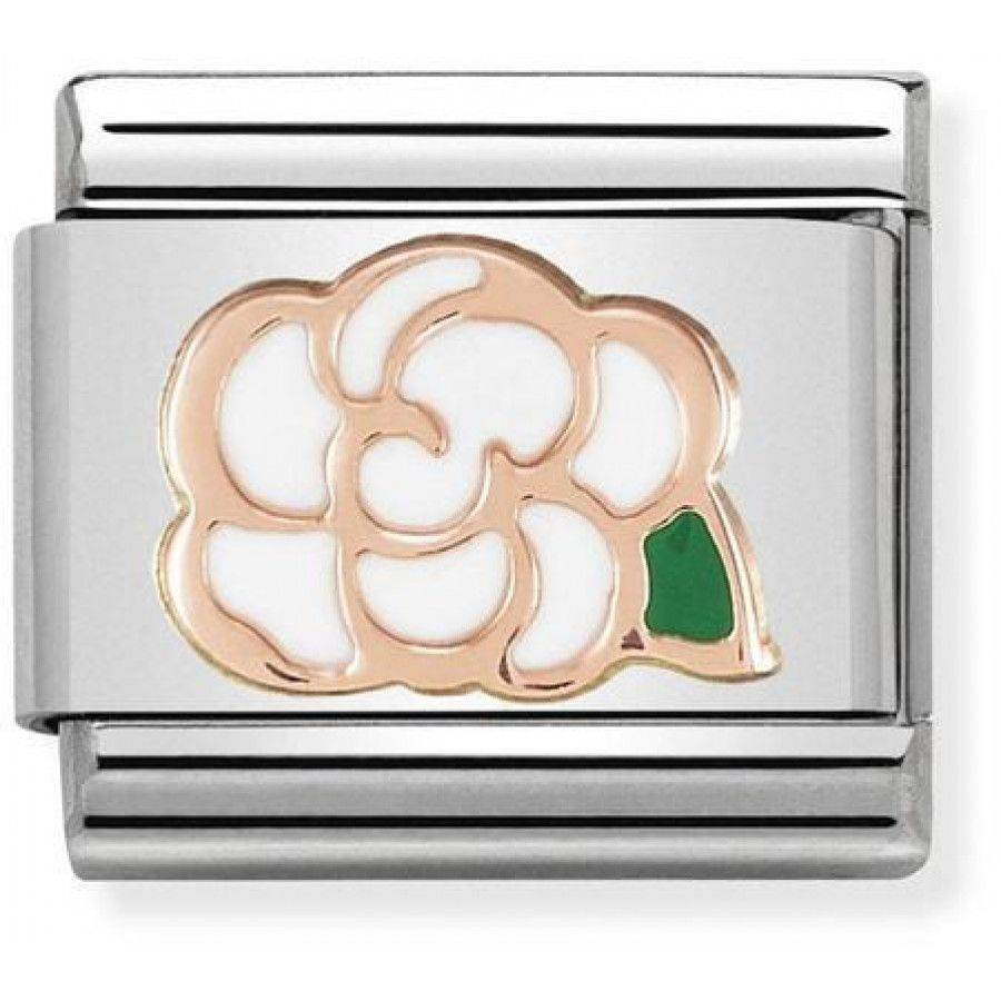 Nomination classic composable rose gold and enamel Camelia charm. The perfect link with the elegant Camelia flower for the glamorous bride.