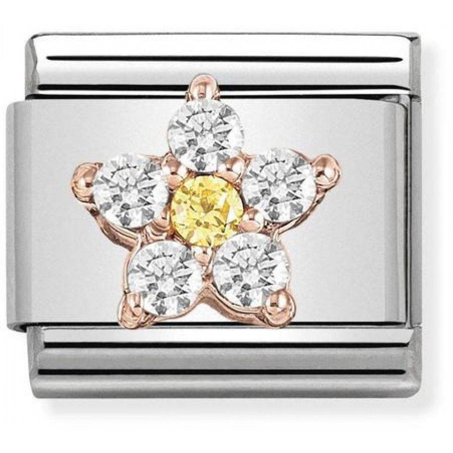 Nomination classic composable flower charm on steel base set in 9k rose gold with white & yellow Cubic Zirconia’s.