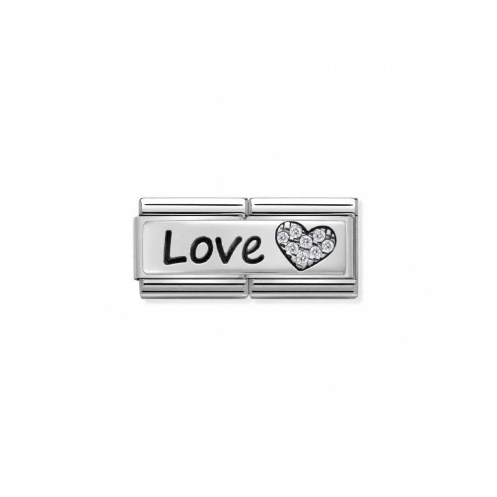 Nomination silvershine double charm engraved with ‘Love’ and a pave set cubic zirconia heart. Stainless steel & sterling silver.
