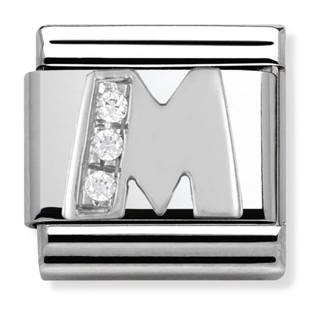 Stainless steel link featuring a Silver initial M set with cubic zirconia. Fits onto the Nomination composable bracelet.