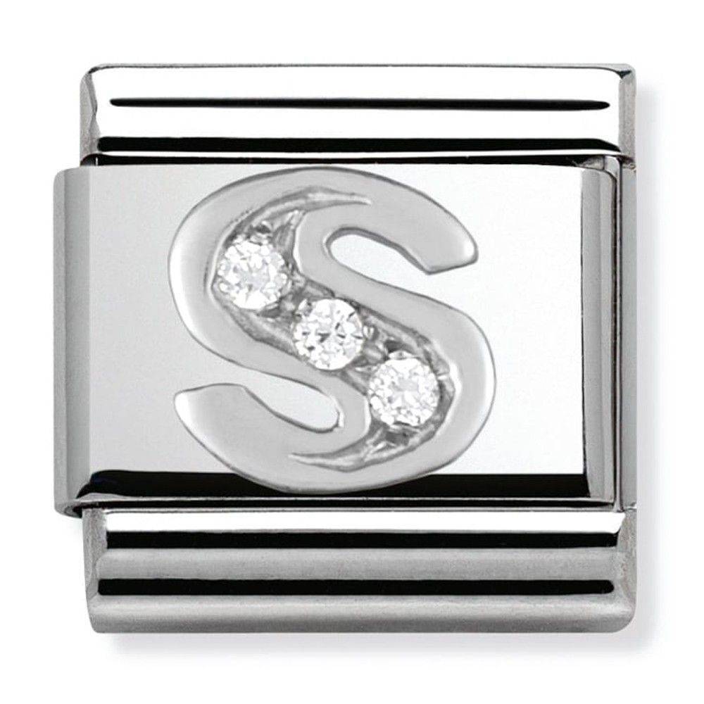 Stainless steel link featuring Silver initial S set with cubic zirconia