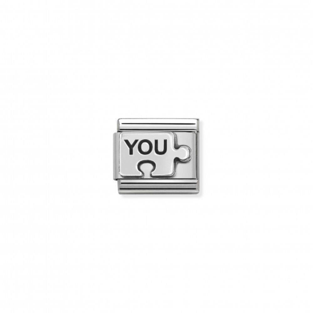 Nomination Stainless Steel link with writing “YOU” and puzzle piece symbol with vintage effect in oxidized Sterling silver. One of 2 Links to pair and share with a person who is your match like a puzzle piece: The perfect fit! #oneformeoneforyou