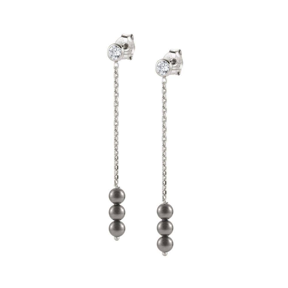 Nomination sterling silver long drop earrings with three grey freshwater pearls.