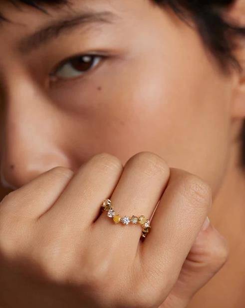 PDPAOLA wavy eternity style ring set with coloured stones, Labradorite Light green iced zirconia Yellow iced zirconia Green zirconia White zirconia. Size 14, UK Size N. 925 sterling silver with an 18ct yellow gold plating.