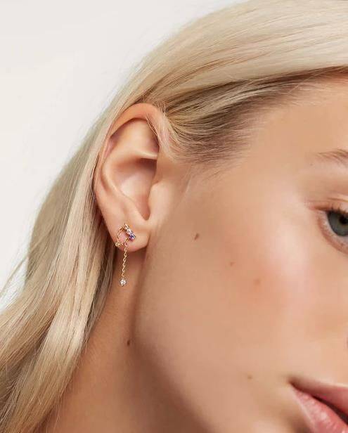 PDPAOLA dainity chain earrings in gold plated with five coloured stones, Sapphire Blue Corundum Rhodolite zirconia Champagne zirconia Golden Yellow zirconia Pure White zirconia. 925 sterling silver with 18ct yellow gold plating.