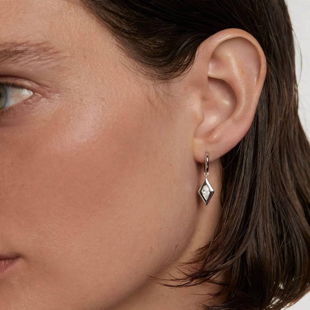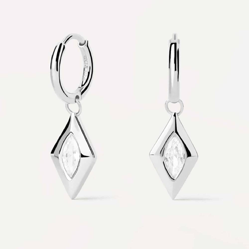 PDPAOLA sterling silver Kate huggie drop earrings set with a striking diamond shaped cubic zirconia.