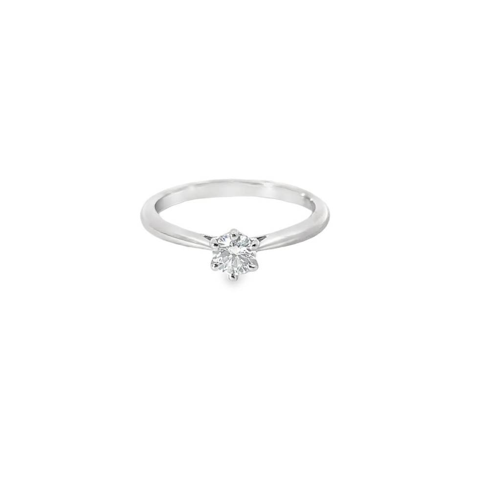 Single round brilliant cut diamond six claw set in a platinum ring mount. 0.32ct diamond, GIA certificated H colour, Si1 clarity.