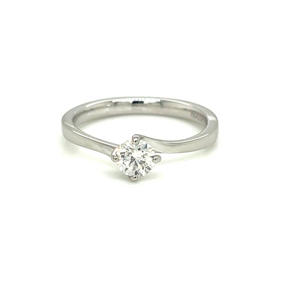 A classic solitaire ring with a twist. A round brilliant cut diamond sits in a four claw twist setting on a platinum band. 0.40ct diamond, F colour, Si2 clarity. GIA certificated.