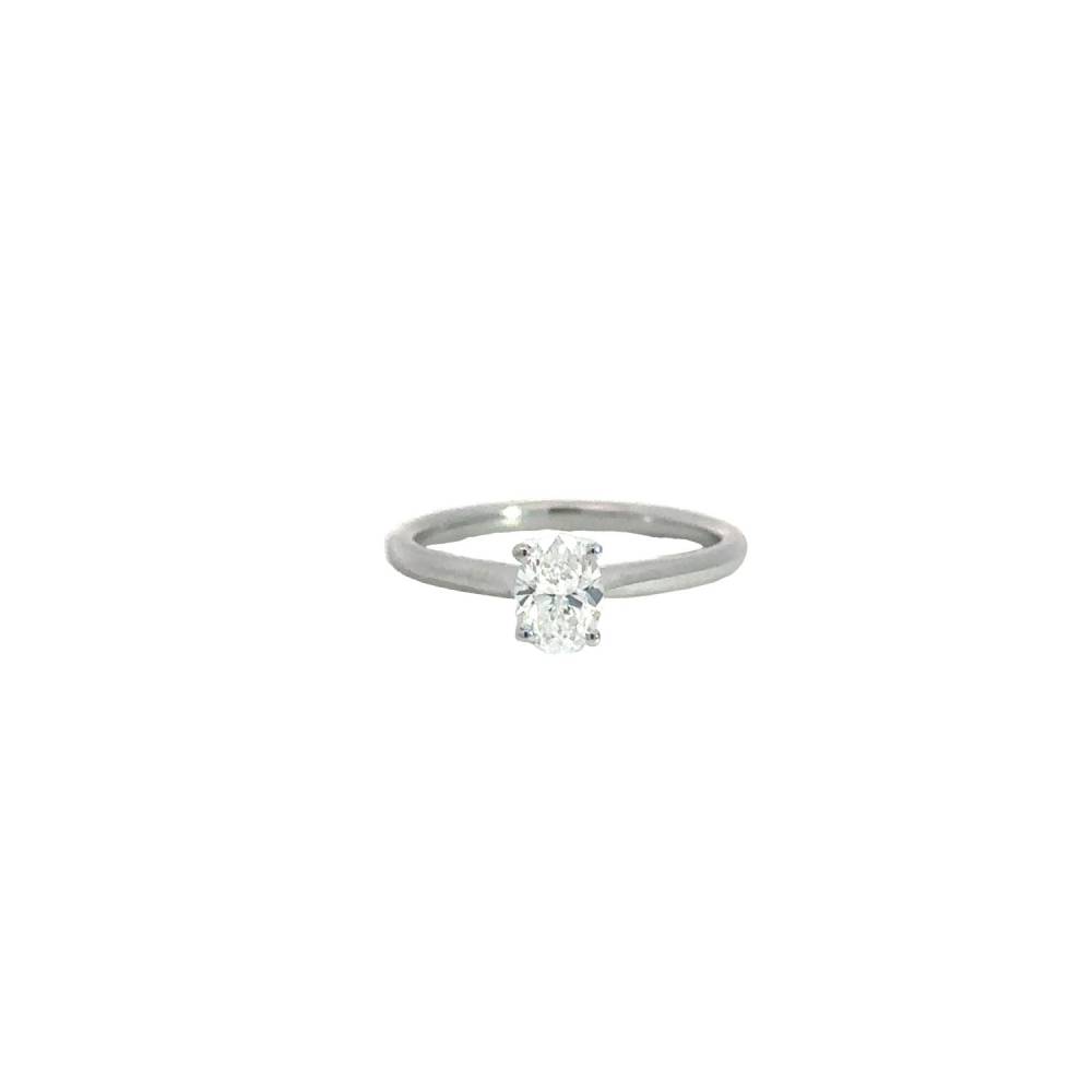 A single oval diamond four claw set in a platinum ring mount. A beautiful timeless classic diamond ring. 0.60ct diamond. GIA certificated D colour, Si1 clarity.