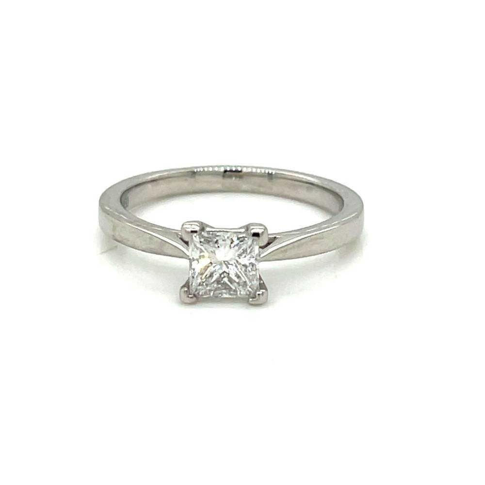 Platinum single stone princess cut diamond ring, in a classic four claw setting. 0.61ct diamond, GIA certificated D colour, Si1 clarity.