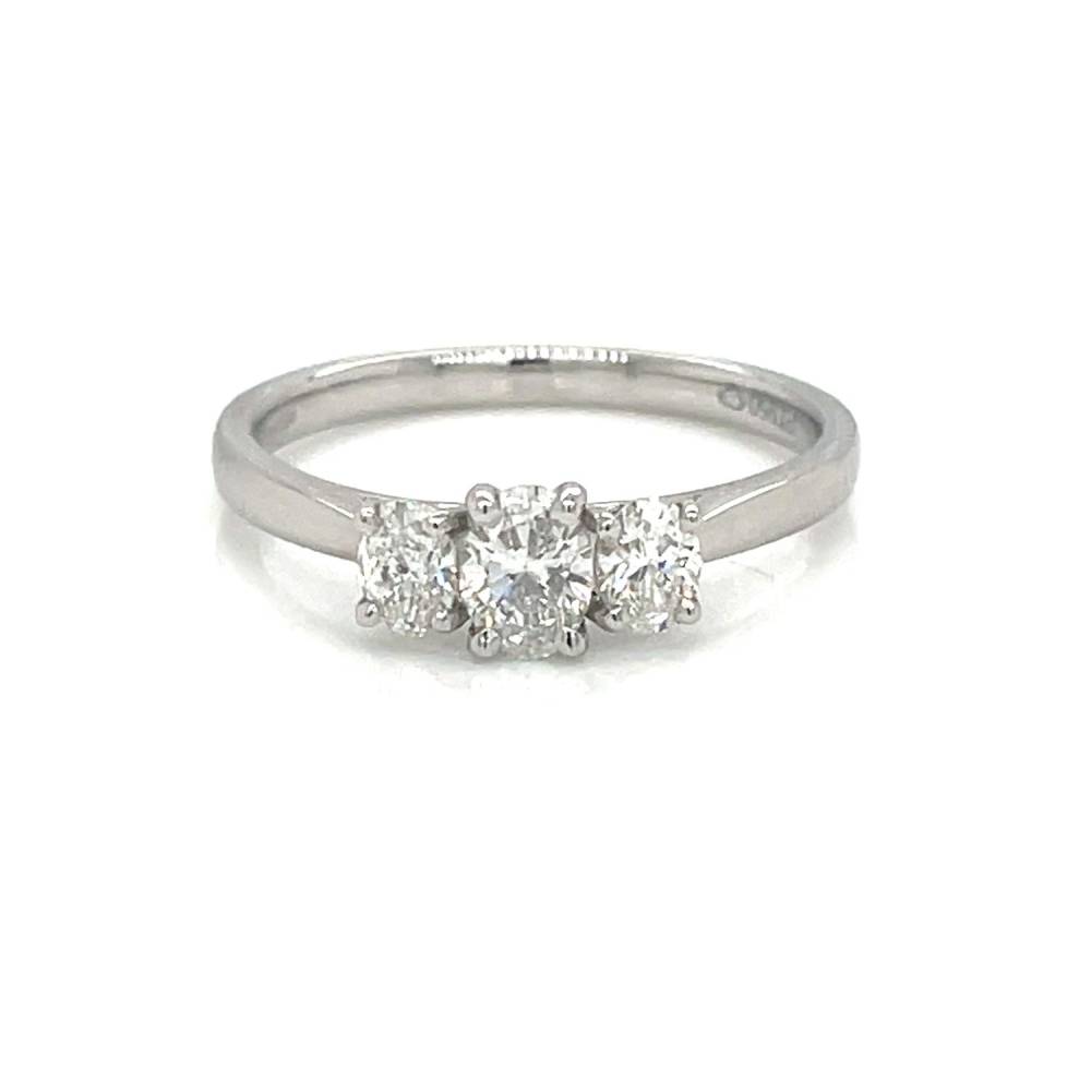 Three graduated oval diamonds each in a four claw setting on a platinum band. 0.63ct total diamond weight, consisiting of a central 0.30ct GIA certificated F colour, Si2 diamond and two outer diamonds with a total carat weight of 0.33ct.