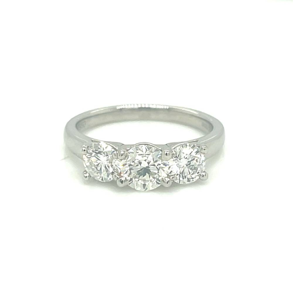 Three graduated round brilliant cut diamonds each four claw set in a platinum ring mount. 1.53ct total diamond weight. These diamonds are approximately G/H colour, Si clarity.