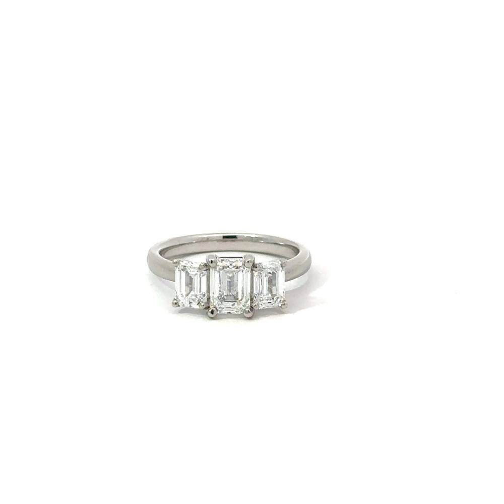 Three graduated emerald cut lab grown diamonds sit side by side in this three stone ring. Claw set in a platinum ring mount this ring has a total carat weight of 2.10ct. Centre lab grown diamond 1.00ct IGI certificated D colour, VS1 clarity. Other lab grown diamonds 1.10ct total weight.
