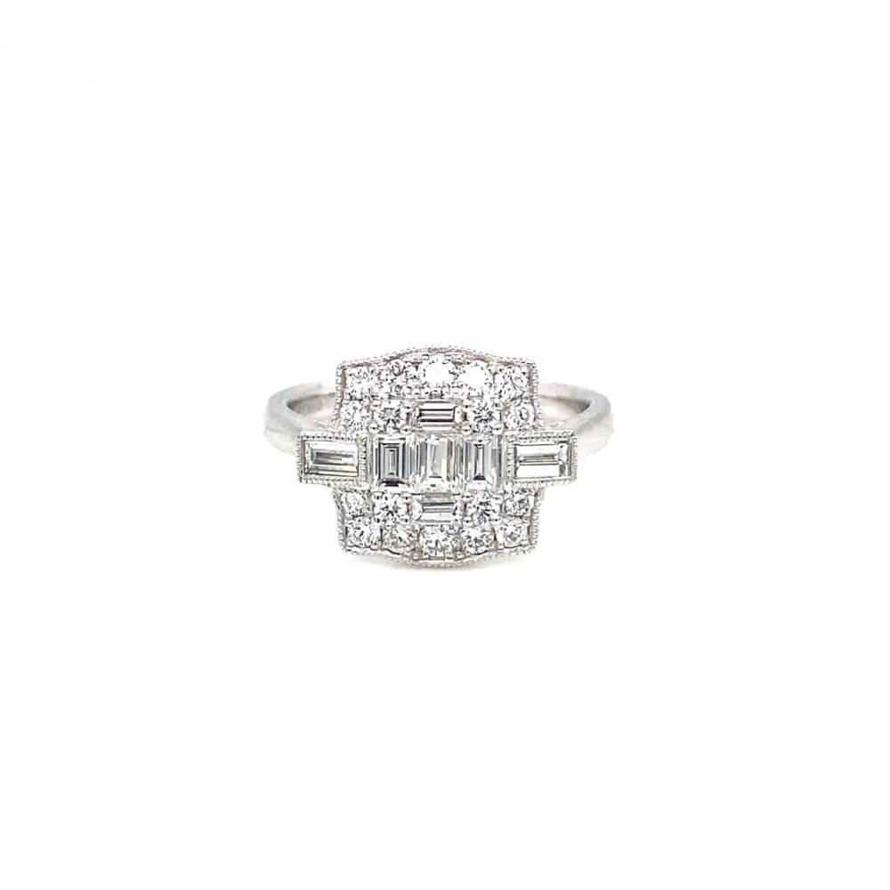 An Art Deco style cluster ring made up with round brilliant cut diamonds and baguette cut diaomonds to give the beautiful shape set in a platinum ring mount. As with most of our rings this ring can be ordered in all precious metals. 0.92ct total diamond weight.
