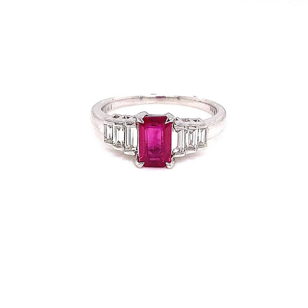 A central rectangular Burma ruby is four claw set with three graduated baguette cut diamonds either side set in a platinum ring mount. This Ruby is 1.60ct and comes with a certificate. 0.40ct total diamond weight.