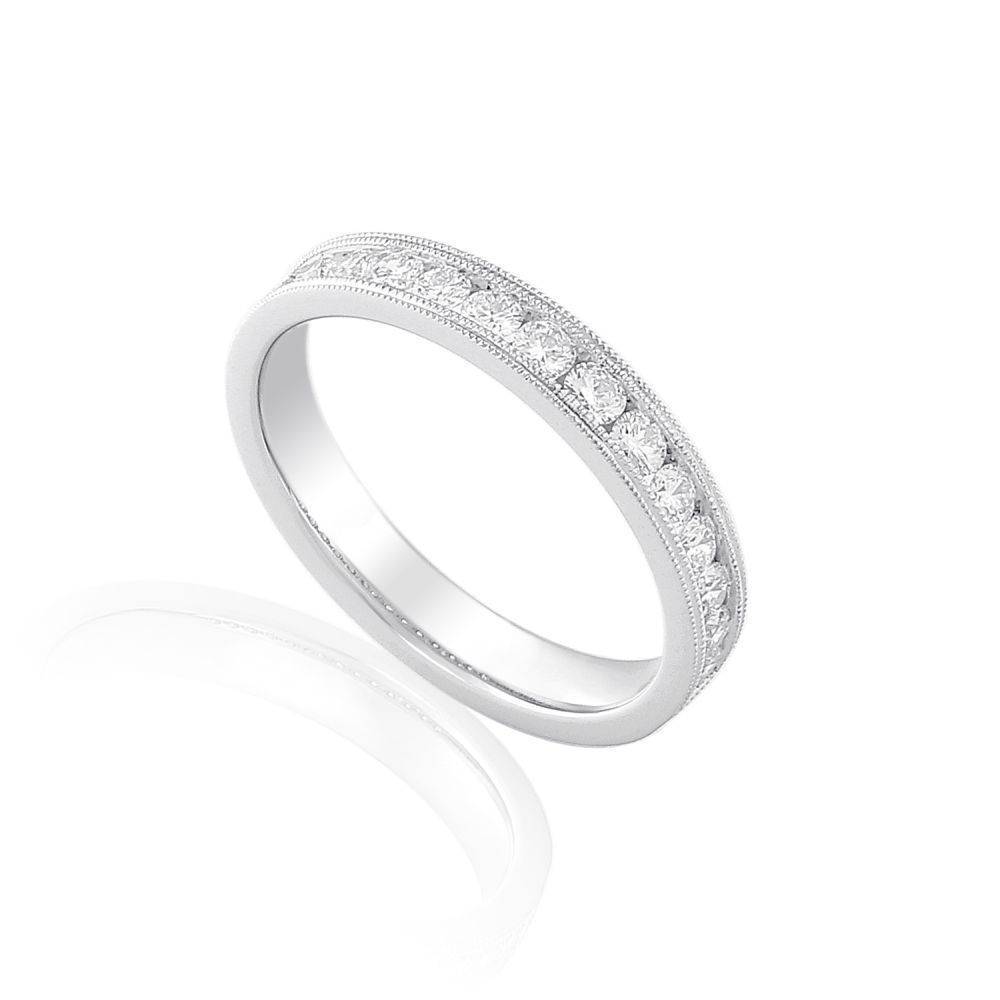Platinum round brilliant cut diamond channel set half eternity style ring with a millegrain edge. 0.25ct total diamond weight. H colour. Si2 clarity. (Image not to scale)
